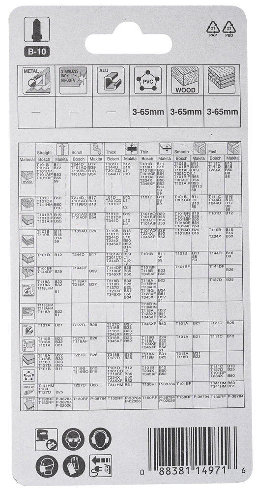 Stichsägeblatt mit konisch geschliffenem Blattkörper und einer sehr scharfen kreuzgeschliffenen Verzahnung mit 2,9 mm Zahnteilung. Sehr gut für schnelle und saubere Schnitte in Holz und Kunststoff von 3,0 bis 65 mm Materialstärke.
