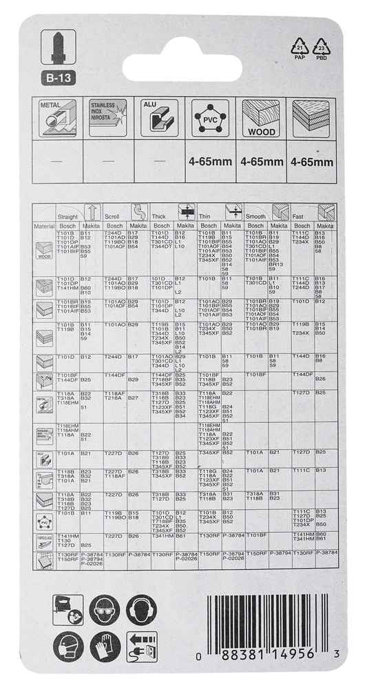 Stichsägeblatt mit einer sehr scharfen kreuzgeschliffenen und geschränkten Verzahnung mit 3,2 mm Zahnteilung. Für schnelle Schnitte in Weichholz und Kunststoffen von 4 bis 65 mm Materialstärke.
