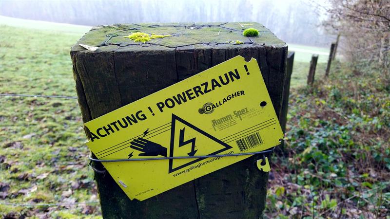 Elektrozäune unterliegen der Kennzeichnungspflicht. Dieses Warnschild entspricht exakt den aktuellen Vorgaben und muß entsprechend den gültigen Richtlinien an verschiedenen Stellen eines Elektrozauns montiert werden. Die Anbringung erfolgt durch Einhängen an den Draht, die Sicherung ist mit Verbindungsschrauben oder Kabelbindern möglich.