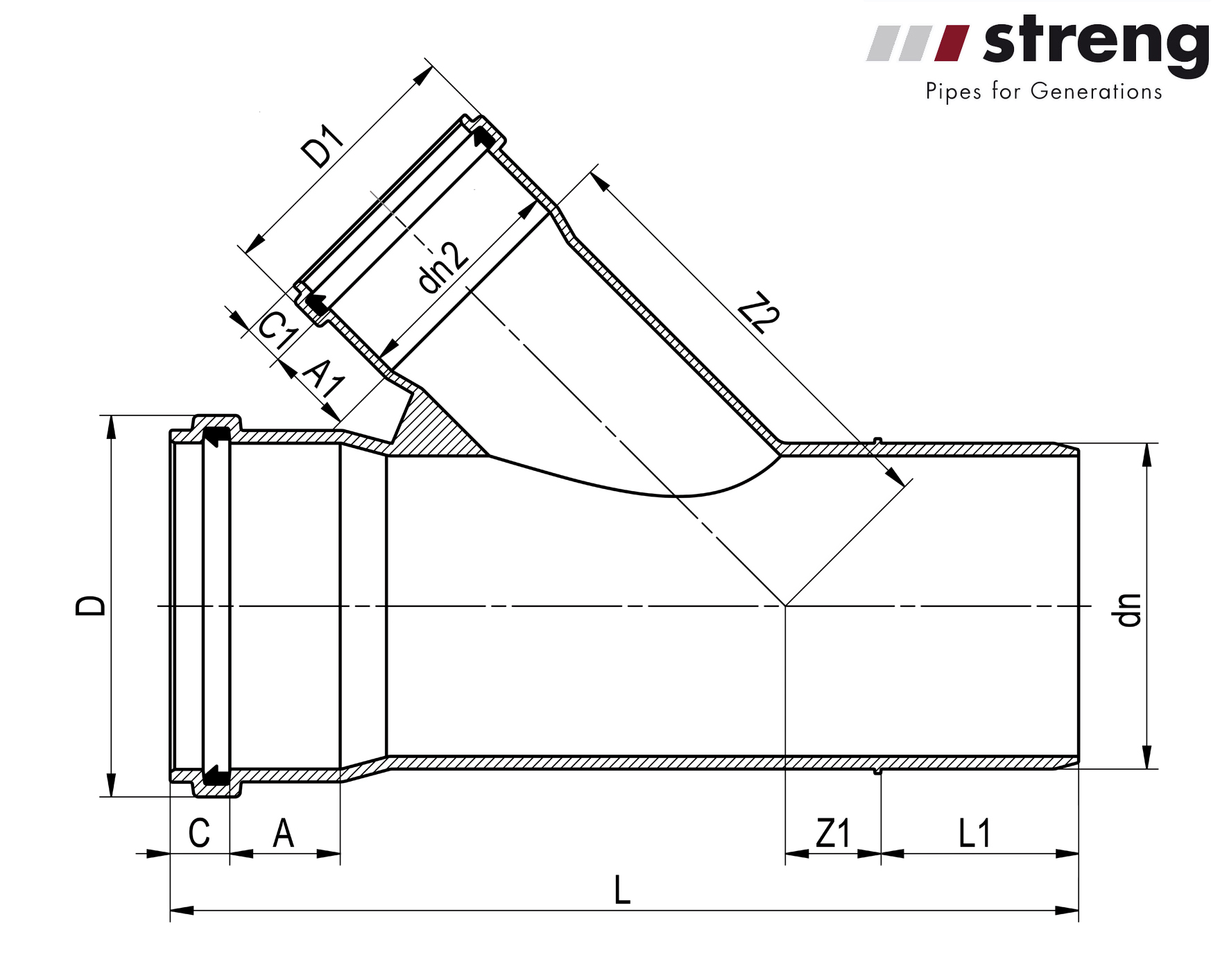 STRENG HSP Steckmuffen-Abzweiger 45° reduziert, gespritzt inkl. Dichtungen