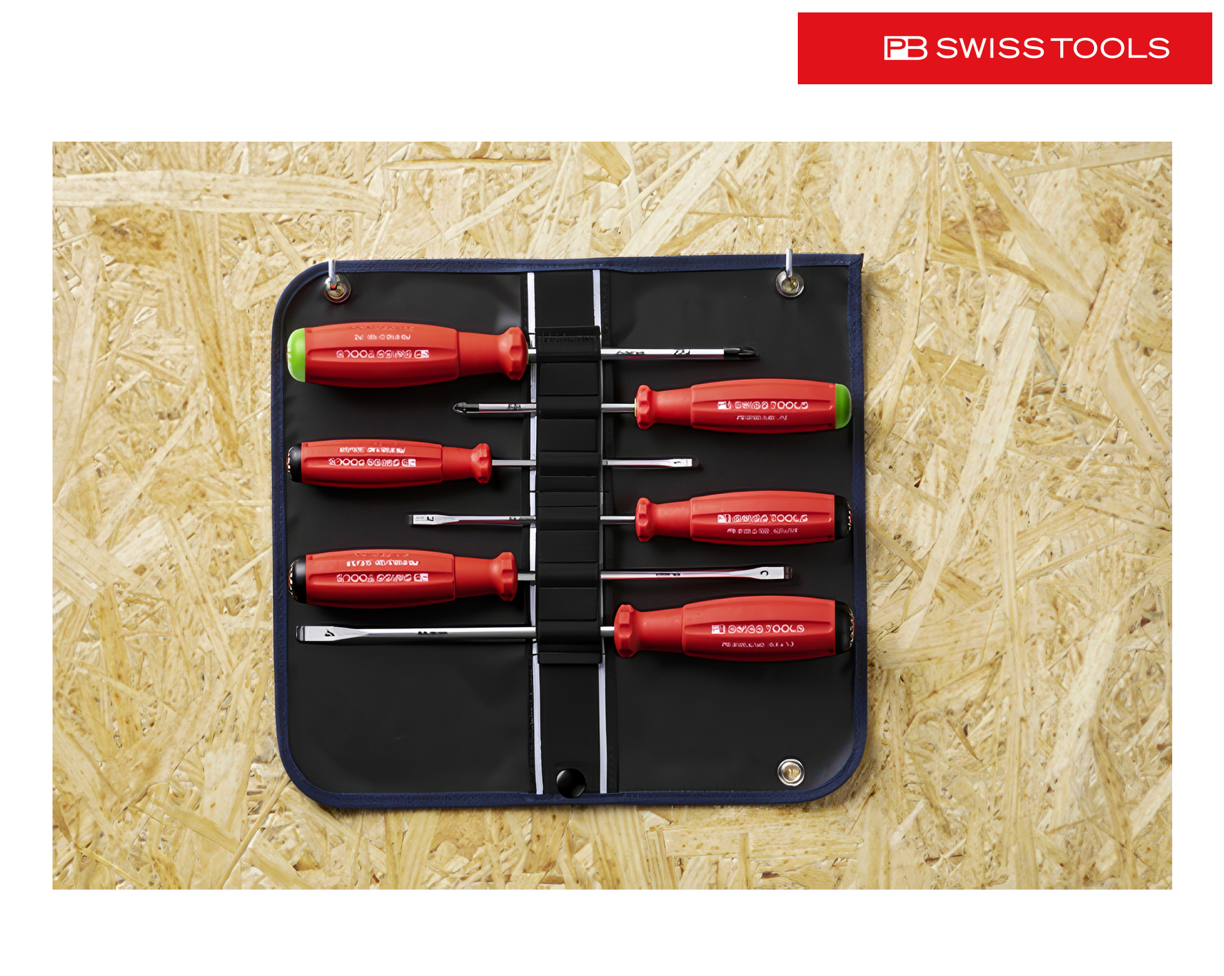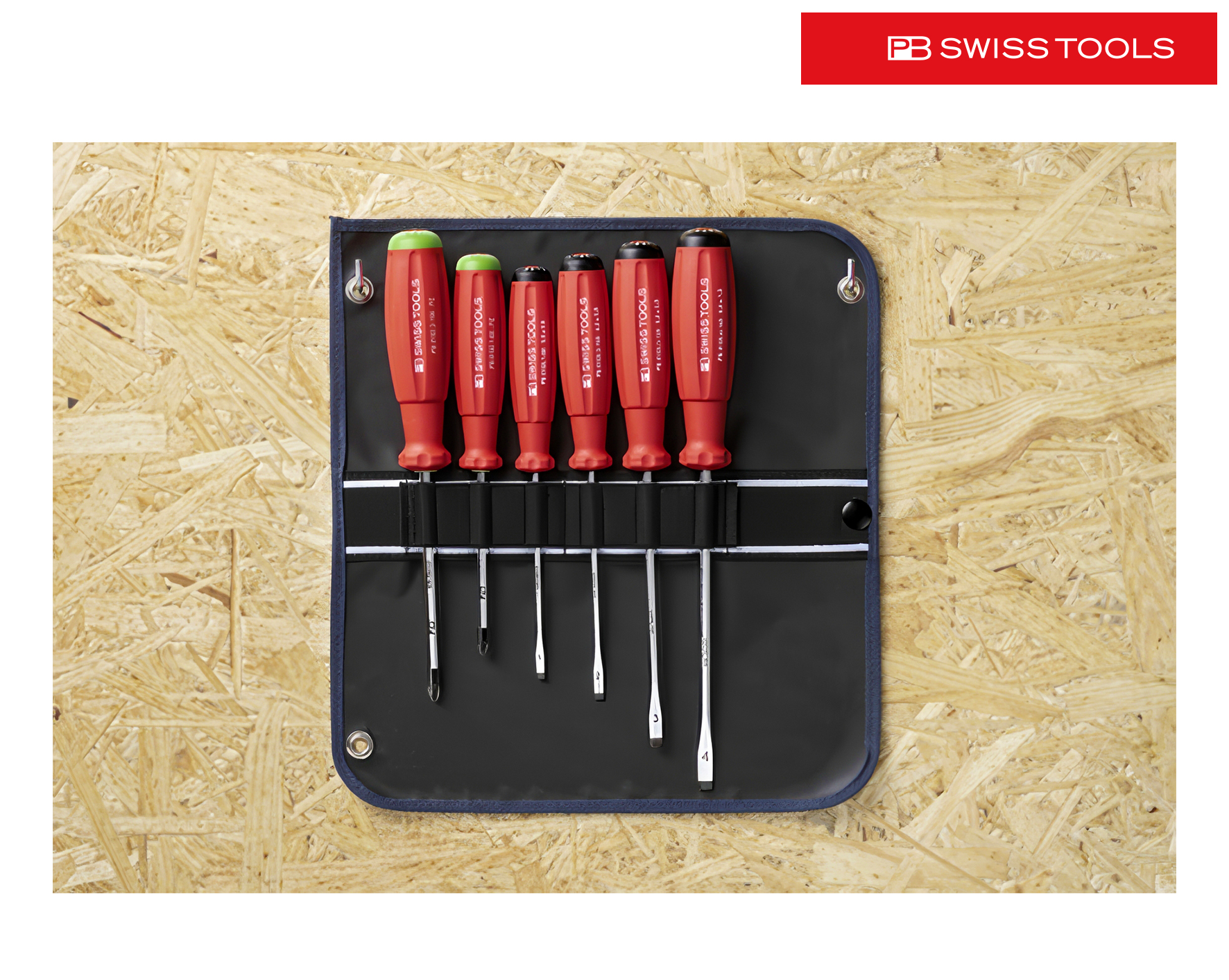 Farbcode pro Schraubentyp, schnelle Identifikation, sechs Qualitätswerkzeuge übersichtlich geordnet, sofort einsatzbereit, 2-in-1 Rolltasche: ausgerollt horizontal wie vertikal aufhängbar, eingerollt kompaktes Transportetui, aus robustem Polyestergewebe, abwaschbar und leicht zu reinigen dank PVC-Beschichtung