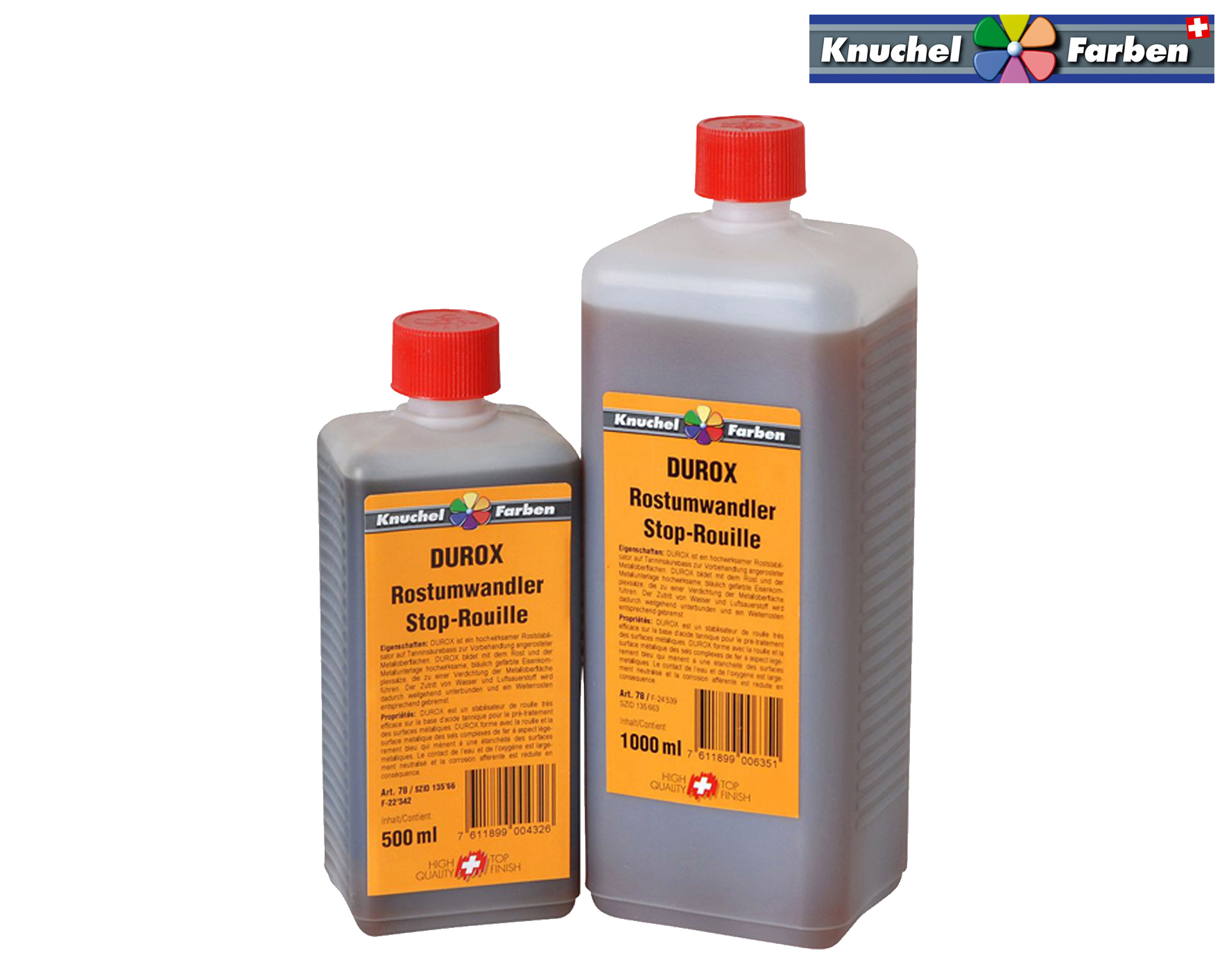 DUROX ist ein hochwirksamer Roststabilisator auf Tanninsäurebasis zur Vorbehandlung angerosteter Metalloberflächen. DUROX Rost-Umwandler bildet mit dem Rost und der Metallunterlage hochwirksame, bläulich gefärbte Eisenkomplexsalze, die zu einer Verdichtung der Metalloberfläche führen. Der Zutritt von Wasser und Luftsauerstoff wird dadurch weitgehend unterbunden und ein Weiterrosten entsprechend gebremst. Durch den Zusatz von Rostinhibitoren, die das Metall zusätzlich passivieren, sowie Filmbildnern, die den temporären Schutz verstärken, bildet DUROX eine Haftbrücke für einen nachfolgenden Anstrichaufbau. DUROX lässt sich auch bei niedrigen Temperaturen auftragen und kann auf noch feuchtes Eisen gestrichen werden.