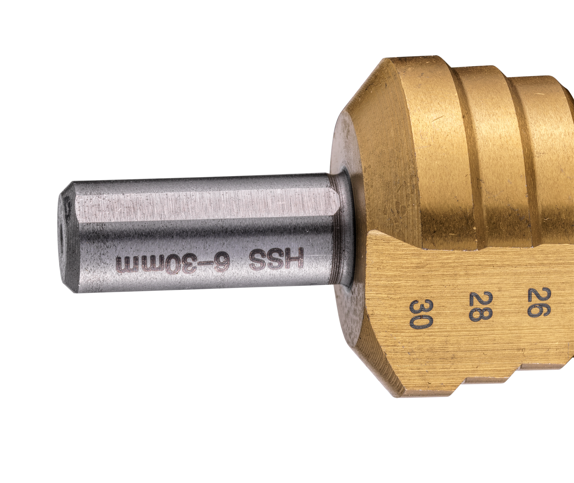 Dieser Stufenbohrer mit zwei tiefengeschliffenen geraden Spannuten gewährleistet ein ratterfreies Arbeiten bis 4 mm Materialstärke. Durch seinen Kreuzanschliff ist dieser Stufenbohrer selbstzentrierend und benötigt nur eine geringe Vorschubkraft. Der 3-Flächenschaft sorgt für eine optimale Kraftübertragung bei handgeführtem Einsatz.
