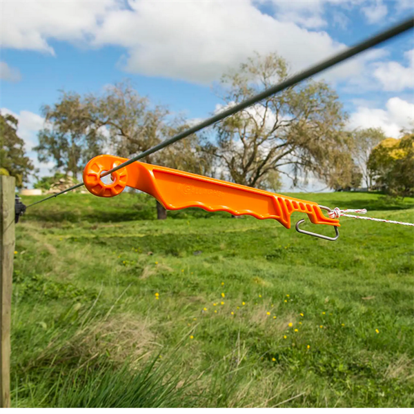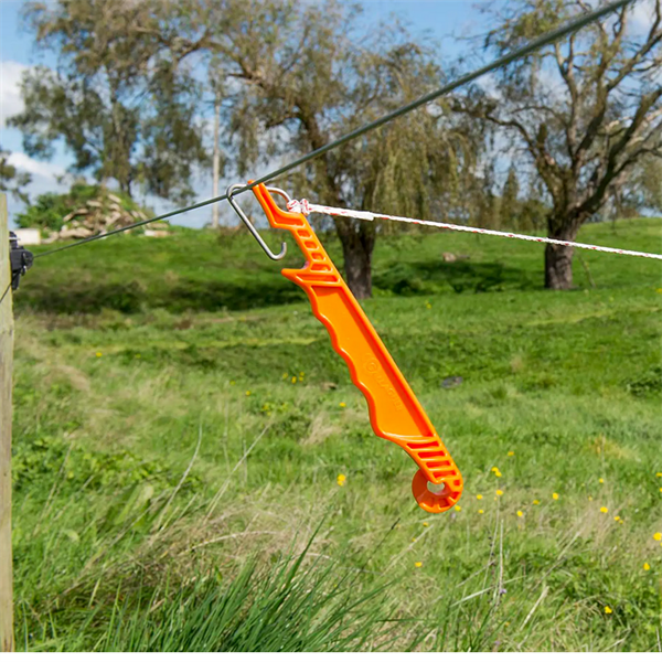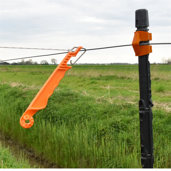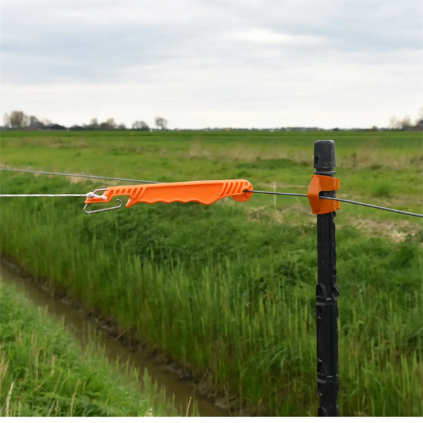 Durch das Binden einer Schlaufe in der Litze kann diese einfach an der Öse im Griff befestigt werden. Über den Haken am vorderen Griff wird der Strom nicht übertragen, über den Metallhaken auf der Rückseite jedoch schon. Das ist nützlich, wenn Sie den Griff z. B. an einem Stück Maschendraht befestigen wollen. Durch die Verwendung des orangefarbenen Hakens wird der Strom nicht von der Haspel auf den Maschendraht übertragen. In Situationen, in denen die Weiterleitung des Stroms gewünscht ist, kann der Metallhaken verwendet werden.