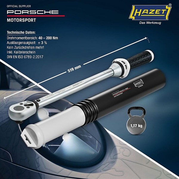 HAZET Porsche Motorsport – Racing Tool Line · Länge: 519 mm · Drehmomentbereich : 40?–?200 Nm · Genauigkeit: 3 % · 1/2 Zoll Vierkant