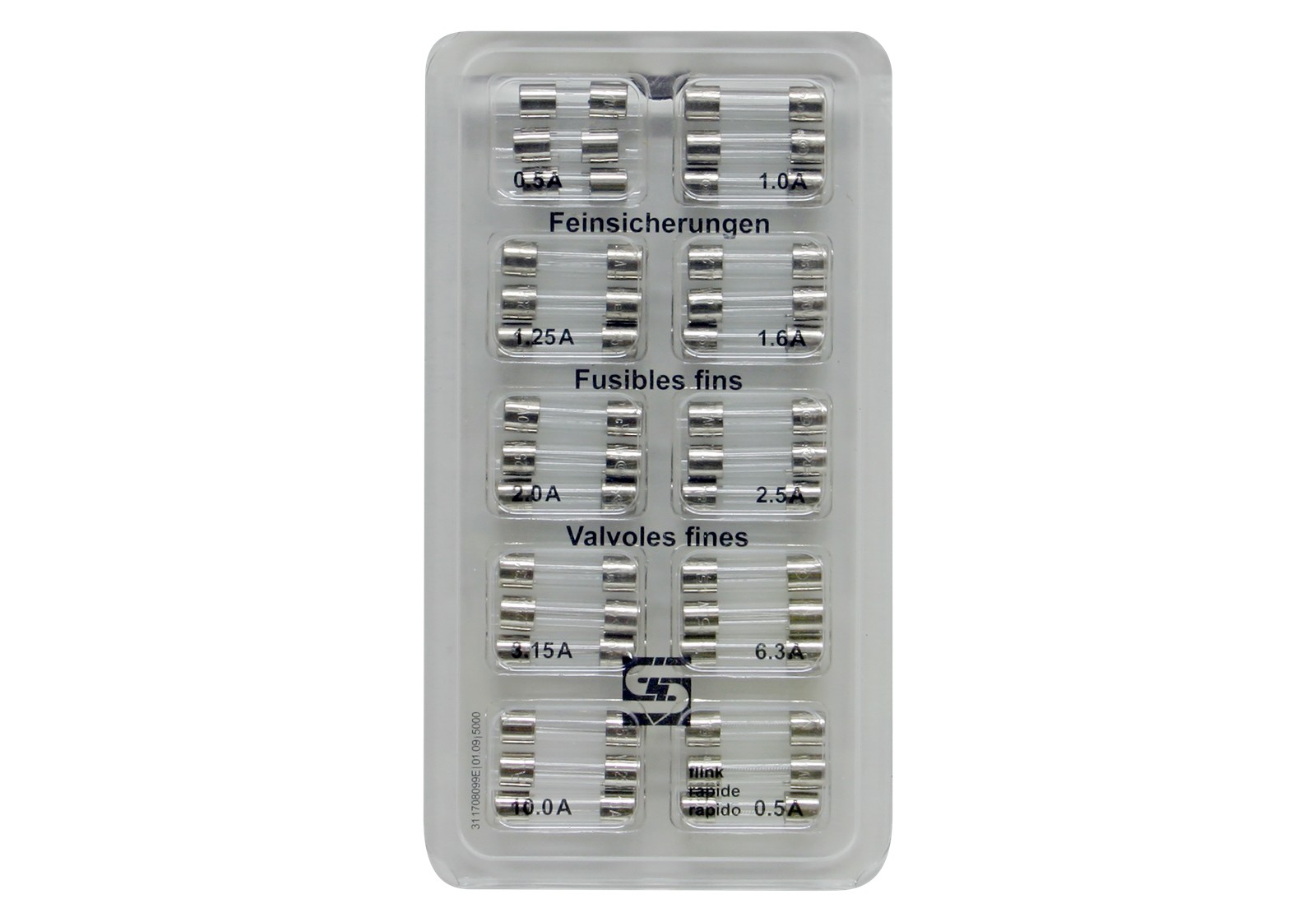 Das Feinsicherungssortiment enthält träge Sicherungen in verschiedenen Nennströmen und bietet eine zuverlässige Absicherung elektronischer Geräte. Jede Sicherung hat eine Grösse von 5x20 mm, mit Ausnahme der 0.5A Rasiersteckdosen-Sicherung, die im Format 5x15 mm ausgeführt ist. Das Set umfasst je drei Sicherungen der gängigsten Werte und eignet sich für vielfältige Anwendungen.
